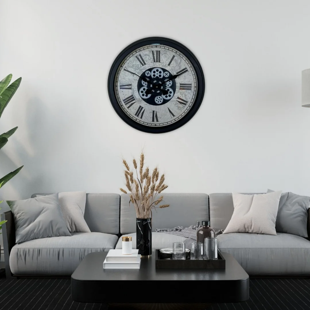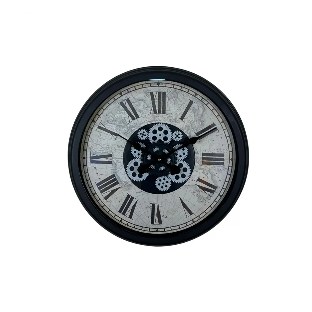 Klasik Roma rakamları, dünya haritası zemin tasarımı ve hareketli çark detaylarıyla tasarlanan bu 60 cm duvar saati; yaşam alanlarınıza güçlü, karakterli ve sofistike bir atmosfer kazandırır.