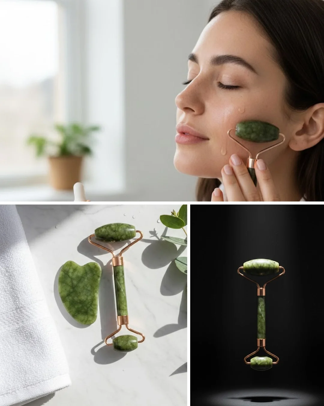 Yeşim roller ve gua sha seti, minimal ama etkili bir bakım rutini sunar. Doğal taş yüzeyi ciltle uyumlu yapıdadır.Geniş ve dar roller başlıkları ile hedefli kullanım sağlar. Gua sha taşı ile yüz hatlarında şekillendirme yapılabilir.