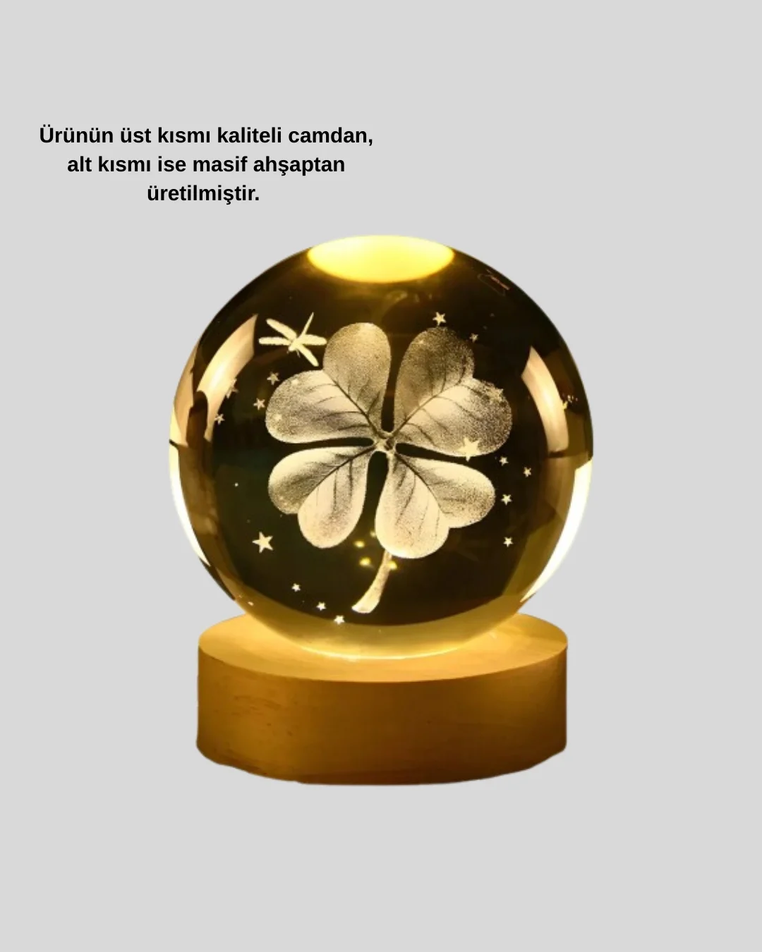 Modern minimalist dekorasyon anlayışına uyum sağlayan bu ışıklı cam küre, sade ama etkileyici tasarımıyla dikkat çeker. Küre içinde yer alan yonca figürü, LED ışık açıldığında derinlikli ve hoş bir görüntü oluşturur. Ahşap taban ise doğal dokusu sayesinde ürünü tamamlar. USB ile çalışması kullanım kolaylığı sağlar. Hem ev hem ofis için ideal bir dekoratif gece lambasıdır.