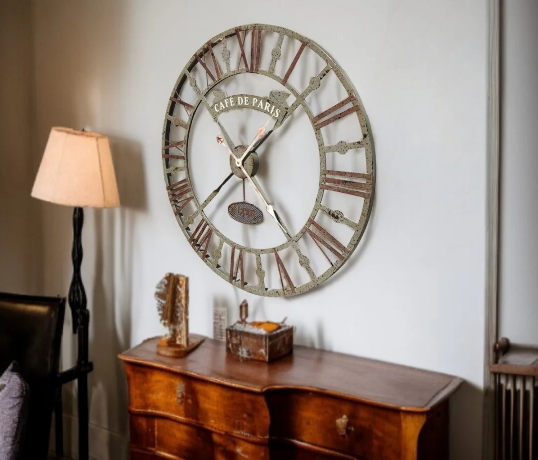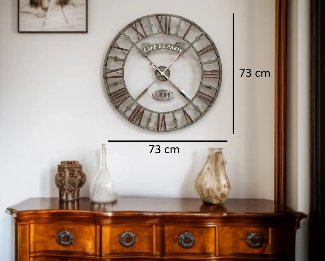 73 cm geniş çapı, Cafe de Paris yazı detayı ve 1886 vurgusuyla dikkat çeken bu özel tasarım duvar saati; klasik Avrupa kafe kültürünün nostaljik ruhunu modern yaşam alanlarına taşıyan benzersiz bir dekoratif objedir. Eskitme metal dokusu sayesinde geçmişin zarafetini yansıtırken, açık kadran (iskelet) yapısıyla mekâna derinlik ve karakter kazandırır.