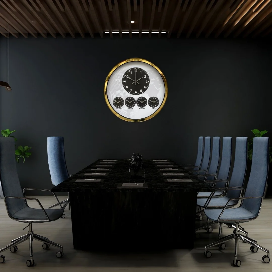 Merkezde yer alan büyük ana saat günlük kullanım için net ve kolay okunabilir yapı sunarken, alt bölümde bulunan New York – London – Moscow – Tokyo zaman göstergeleri uluslararası iş yapan firmalar için fonksiyonel bir çözüm sağlar.