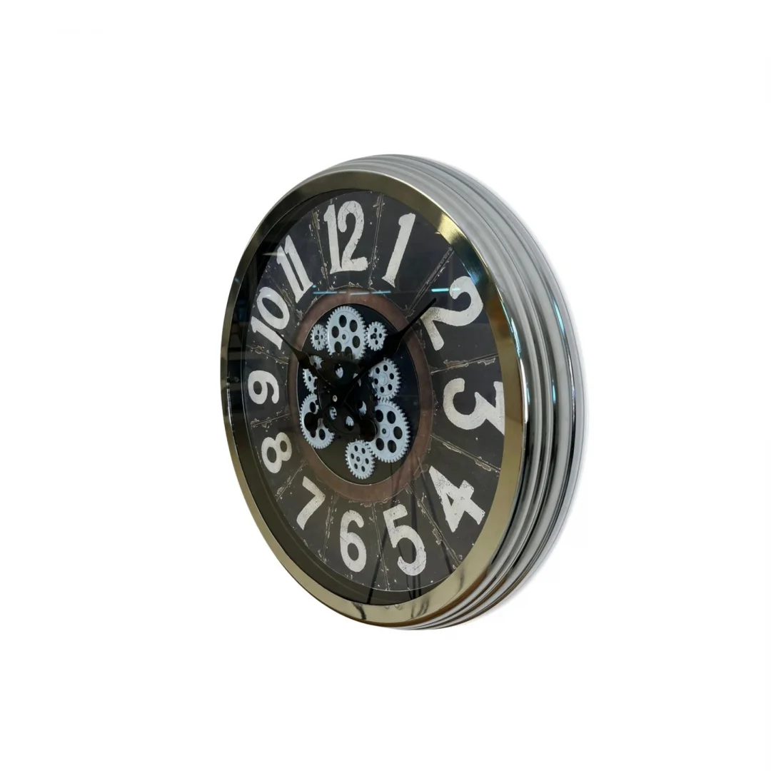 Krom parlak çerçevesi ışığı yansıtarak modern bir görünüm sunarken, merkezde yer alan hareketli çark mekanizması saate dinamik ve mekanik bir ruh katar. Salon, ofis, çalışma odası, kafe ve loft tarzı mekanlar için güçlü bir dekoratif tamamlayıcıdır.