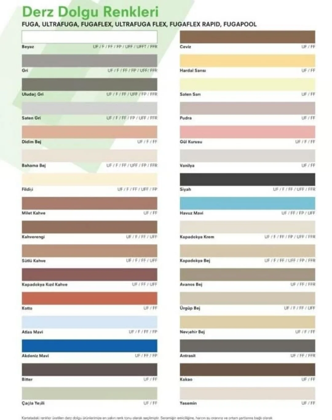 Tanım Silikon katkılı, yüksek performanslı, 1-6 mm derz aralığı için uygun, çimento esaslı derz dolgu malzemesidir. Kullanım Alanları Seramik, granit, kotto, klinker, cam mozaik, mermer, doğal taş gibi kaplama malzemelerinin 1-6 mm arasındaki derz boşluklarının doldurulmasında kullanılır. Banyo, duş, tuvalet gibi ıslak hacimlerde, mutfak gibi kolay kirlenebilen mekânlarda, yatay ve düşey uygulamalarda, mükemmel sonuç verir. Özellikler Zor kirlenir, kolay temizlenir. Suyu iter. Renkleri solmaz Pürüzsüz yüzey sağlar. Çatlamaz. Aşınmaya dayanıklıdır. 32 farklı renk seçeneğine sahiptir.