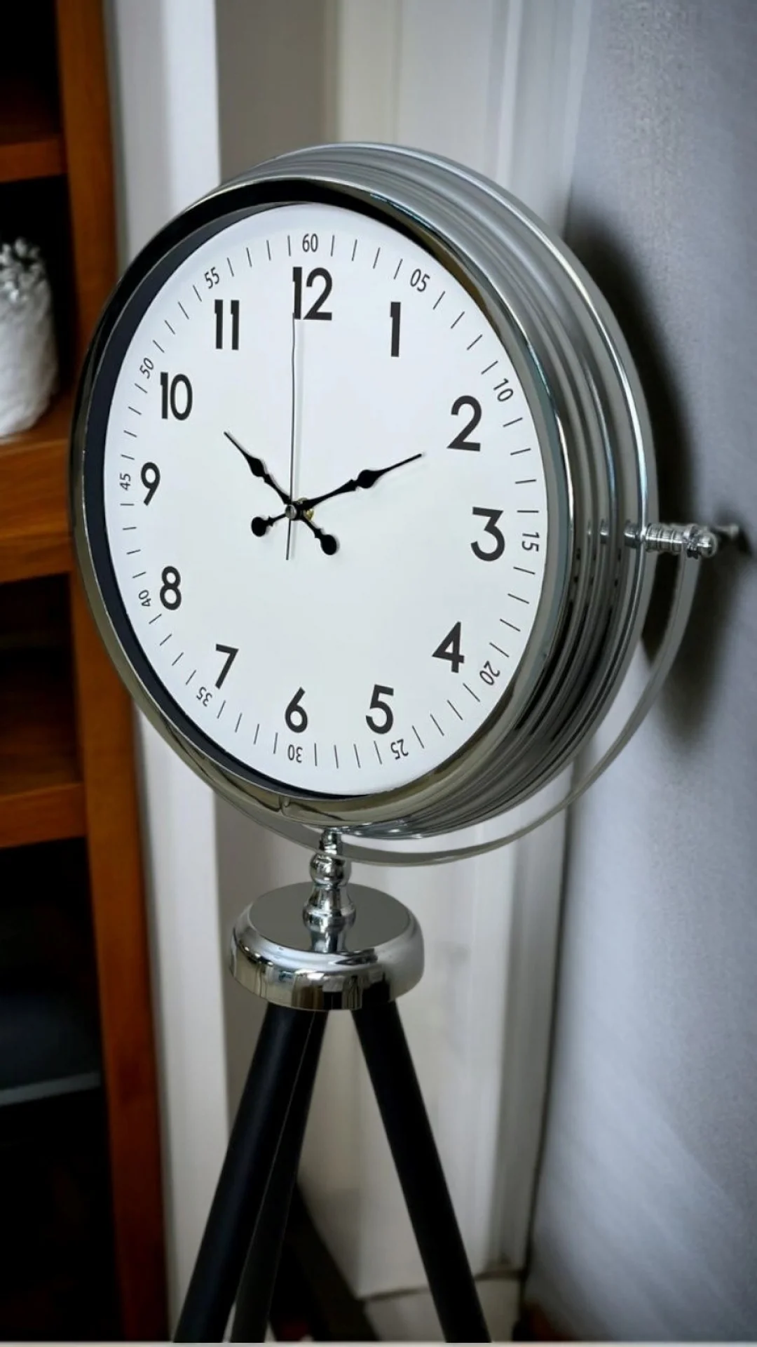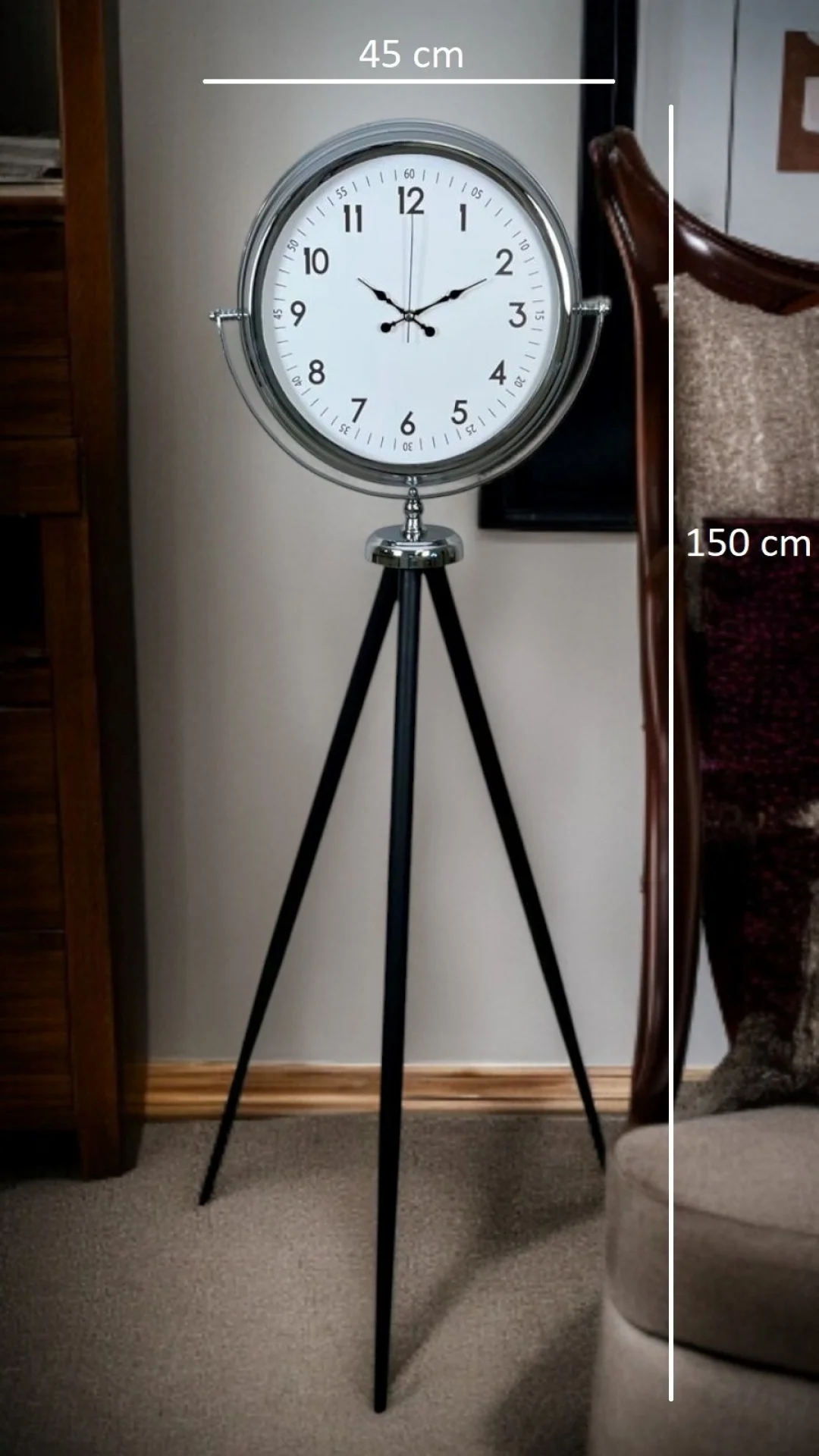 Kaliteli ve sessiz çalışan mekanizması sayesinde ortamda rahatsız edici bir ses oluşturmaz; ev, ofis ve ticari alanlarda huzurlu bir kullanım sunar. Modern, klasik ve endüstriyel dekorasyon stilleriyle uyum sağlayan bu tripod ayaklı saat, dekorasyonda fark yaratmak isteyenler için ideal bir seçimdir.