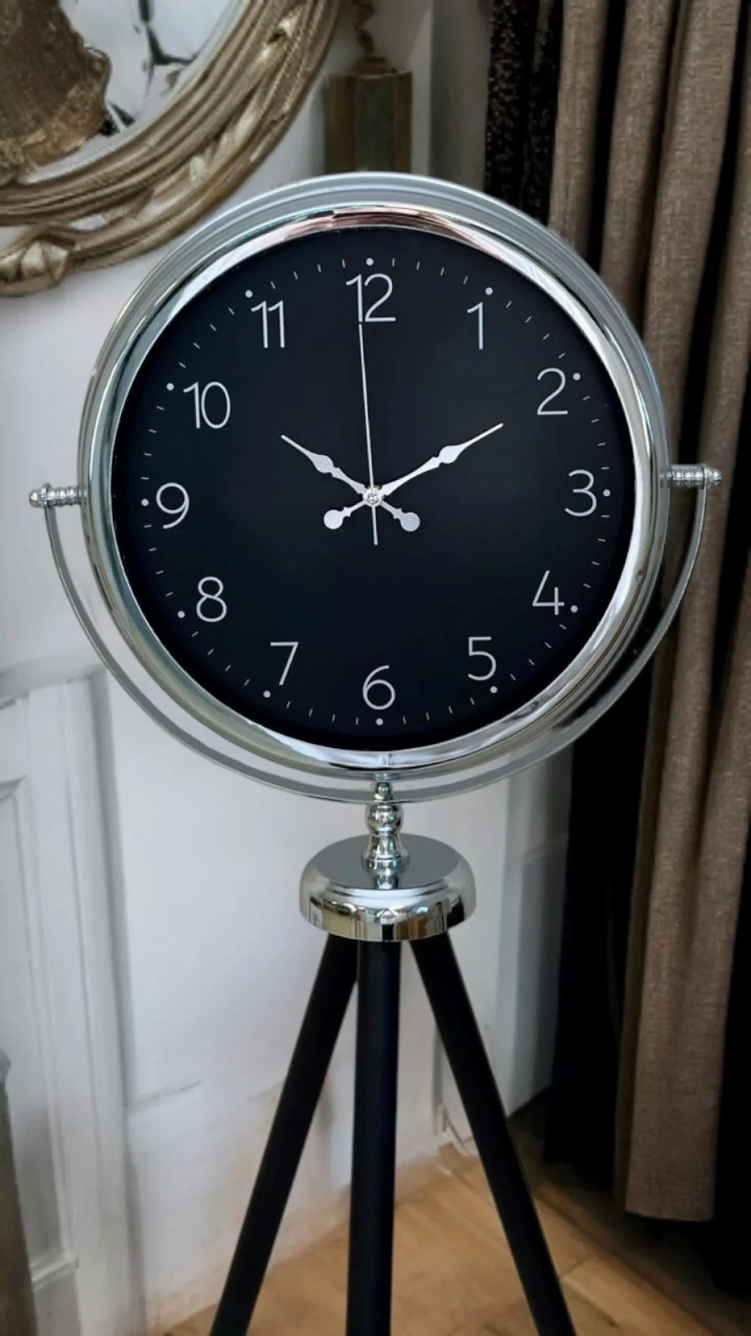 Zamansız tasarımı, güçlü duruşu ve modern çizgileriyle öne çıkan bu krom tripod ayaklı saat, klasik saat anlayışının çok ötesinde, bulunduğu mekâna karakter ve prestij kazandıran özel bir dekoratif üründür. 150 cm yüksekliği ve 45 cm genişliği sayesinde yalnızca zamanı gösteren bir obje değil, mekânın odak noktası haline gelen şık bir tasarım unsuru olarak dikkat çeker.