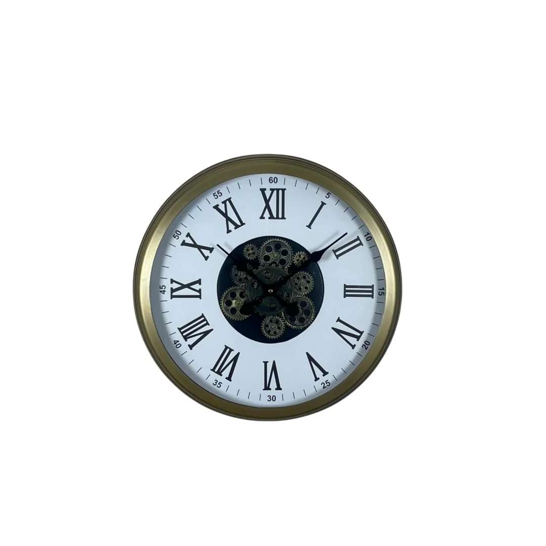 Merkezde konumlanan dekoratif hareketli çark mekanizması, sade tasarıma mekanik bir derinlik kazandırır. 60 cm geniş çapı ile büyük duvarlarda güçlü ve estetik bir odak noktası oluşturur.
