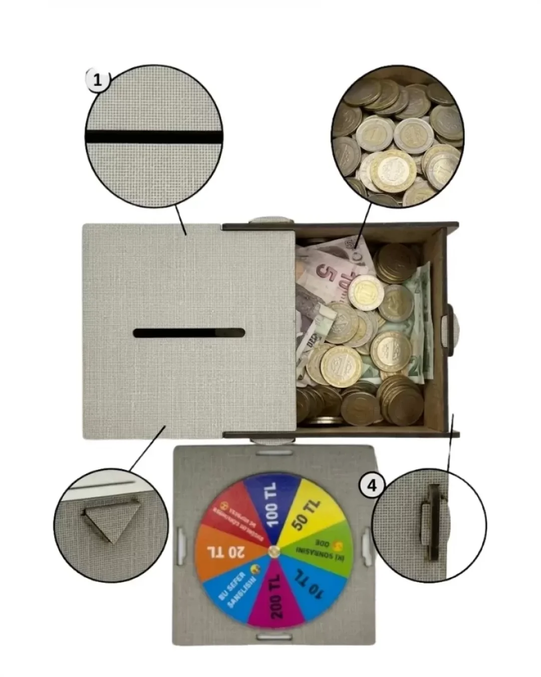 Lazer kesim işçiliğiyle hazırlanan ve şık dokusuyla her mekana uyum sağlayan bu özel tasarım, özellikle çocuklar için para biriktirmeyi alışkanlık haline getirmenin en eğlenceli yolu. Çarkı çevirin, gelen tutarı kumbaranıza atın ve hedefinize adım adım yaklaşırken eğlencenin tadını çıkarın!