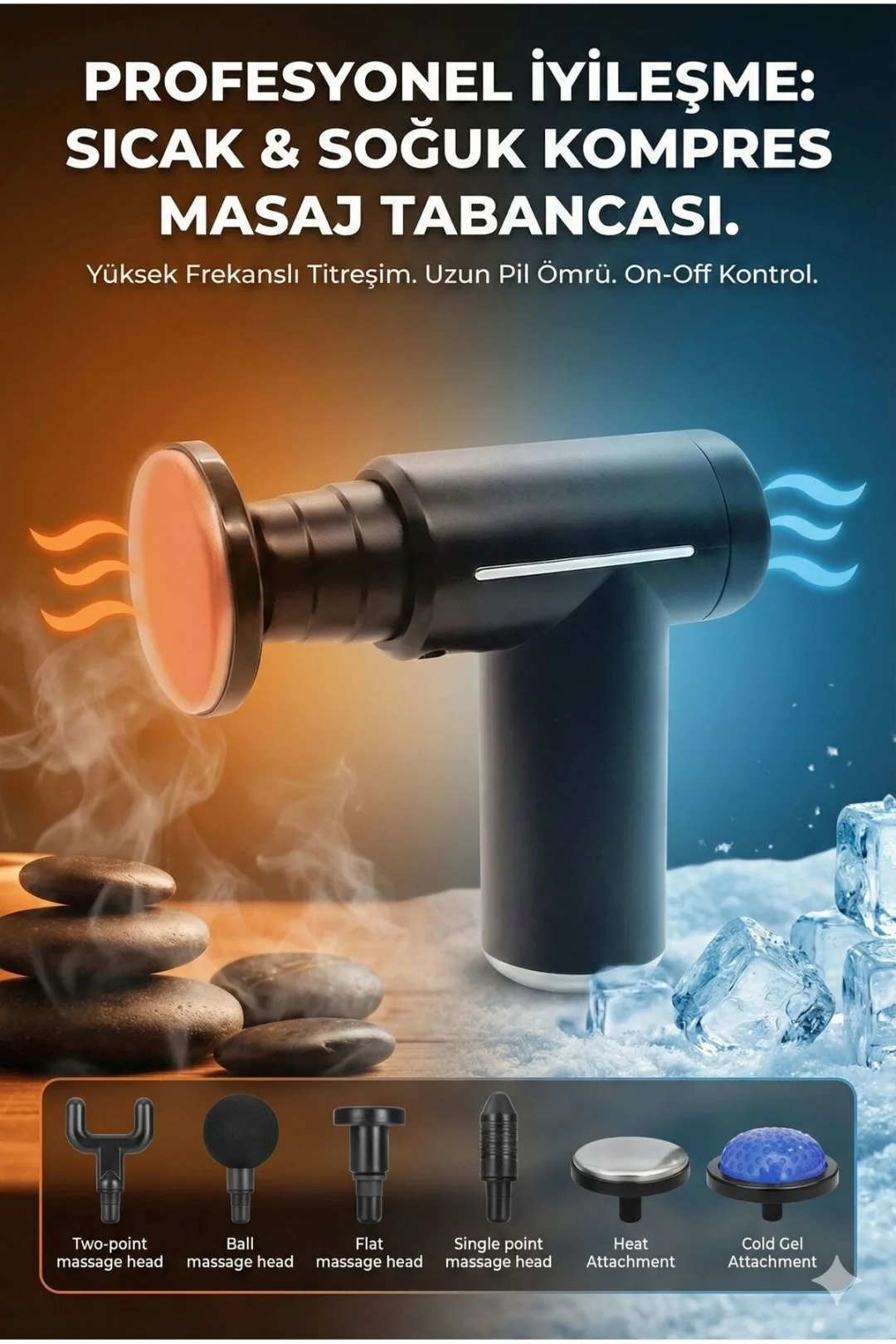 Kas Ağrılarına ve Yorgunluğa Son Verin! Gün boyu masa başında mı çalışıyorsunuz yoksa ağır antrenmanlar mı yapıyorsunuz? İhtiyacınız olan tam profesyonel bakım bu kutunun içinde.; Hem ısıtarak gevşeten hem de soğuk etkisiyle ağrıyı dindiren bu set ile yaşam kalitenizi artırın.; Neden Bu Ürünü Seçmelisiniz? * Çift Etkili Terapi: Sadece titreşim değil, termal etki ile masaj deneyimini ikiye katlar.; * Derin Doku Masajı: Yüksek frekanslı vuruşları ile kasın en derinine inerek gerginliği alır.; * Kişiselleştirilebilir Hız: Hassas bölgelerden sert kas gruplarına kadar ayarlanabilir hız seviyeleri.; * Ergonomik Tasarım: Tek elle kolay kullanım sağlayan, kaymaz ve terletmez tutuş yüzeyi.; * Taşınabilir Güç: Uzun pil ömrü ve Type-C şarj kolaylığı ile spor salonuna veya seyahate götürün.; Başlıkların Kullanım Alanları: 1. Top Başlık: Büyük kas grupları (Kol, bel, kalça, bacak).; 2. U (Çatal) Başlık: Boyun, omurga ve aşil tendonu çevresi.; 3. Mermi (Tek Nokta) Başlık: Tetik noktalar, avuç içi ve ayak tabanı.; 4. Düz Başlık: Tüm vücut gevşemesi.; 5. Isıtma & Soğutma Başlıkları: Özel termal terapi seansları için.; Teknik Detaylar: * Şarj Tipi: USB Type-C * Renk: Mat Siyah * Kontrol: Dijital Dokunmatik / Tek Tuş