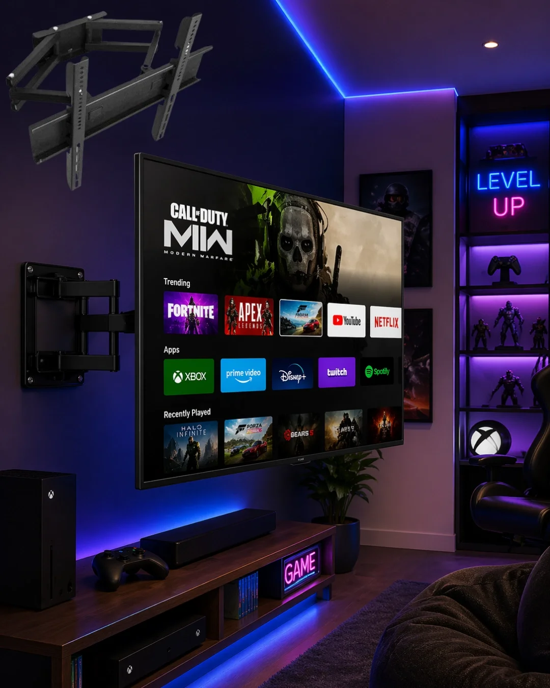 Universal TV askısı, 32 ile 55 inç arası birçok televizyon modeliyle uyumlu profesyonel bir duvar montaj aparatıdır. Evinizde veya iş yerinizde televizyonu daha güvenli ve düzenli kullanmanızı sağlar.Hareketli sistemi ile ekranı sağa sola çevirebilir, öne çekebilir ve geri yaslayabilirsiniz. Eğimli kullanım özelliği sayesinde konfor artar.Sağlam malzemeden üretilmiştir. Uzun süreli kullanım için dayanıklıdır.Kurulum malzemeleri kutu içeriğinde bulunur.Salon, ofis, mağaza, restoran ve otel kullanımına uygundur.