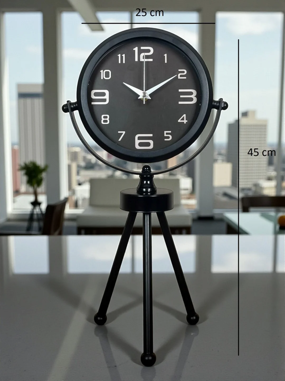 45 x 25 cm ölçülerindeki bu modern siyah üç ayaklı masa saati, minimal tasarımı ve güçlü duruşuyla her ortama şıklık katar. Gerçek cam korumalı kadranı sayesinde net görüntü ve uzun ömürlü kullanım sağlar. Tamamen metal gövdesi ve tripod ayak yapısıyla sağlam, dekoratif ve premium bir görünüm sunar. Sessiz akar saniye mekanizmasıyla ev, ofis ve çalışma alanlarında rahatsızlık vermeden kullanılabilir.