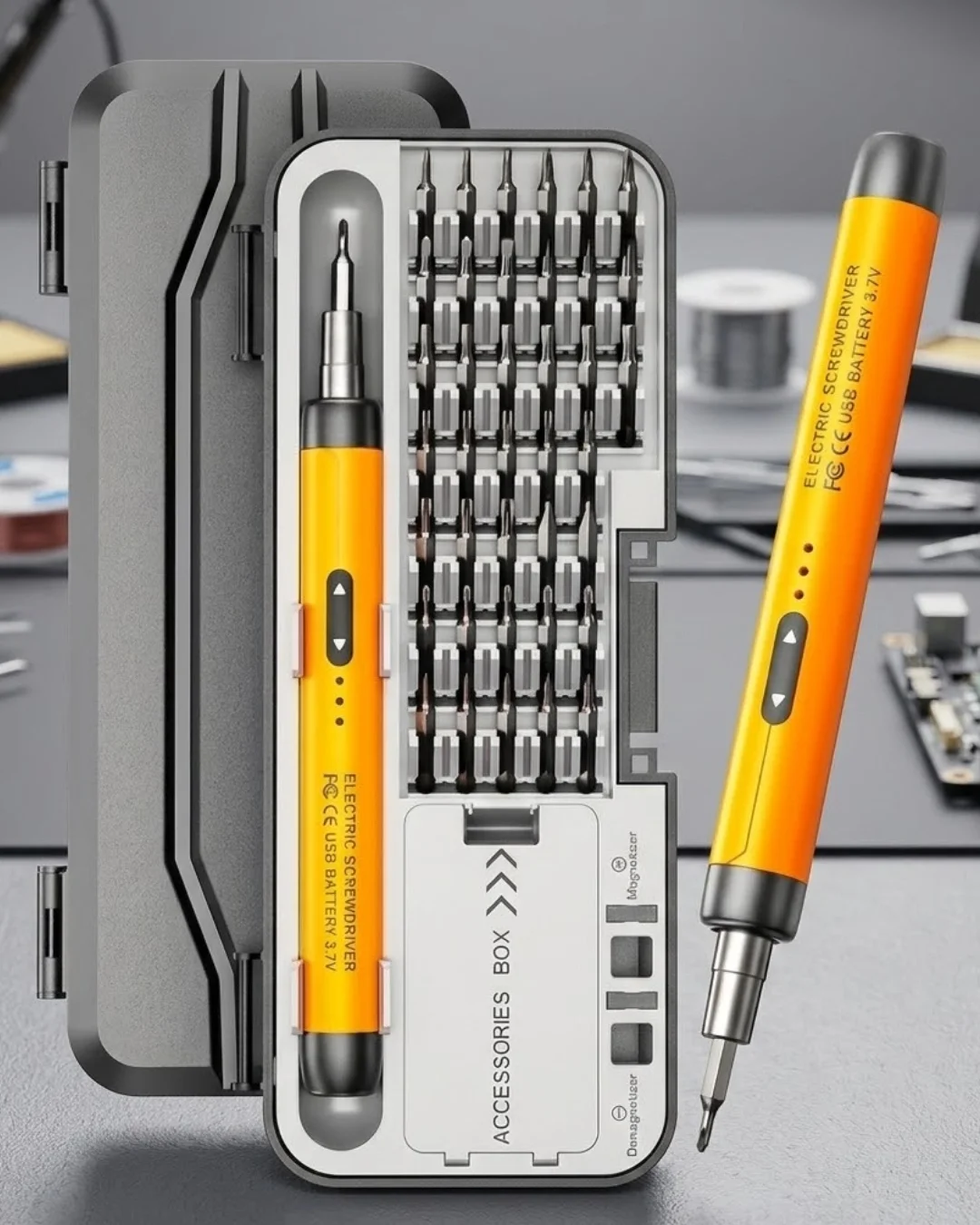 Hassas elektronik ürünlerin söküm ve montaj işlemlerinde maksimum performans sunan bu şarjlı elektrikli tornavida seti, geniş uç seçenekleri ve güçlü motor yapısıyla öne çıkar. 3.7V Li pil ile çalışan sistem, 600mAh kapasiteye sahiptir. Type-C şarj arayüzü sayesinde hızlı ve güvenli şarj imkanı sunar.3.0-3.5 kgf.cm tork değeri ve 1100 devir/dak hız sayesinde mikro vidalarda hassas ve dengeli bir çalışma yapılabilir. İleri ve geri dönüş özelliği, vidaları hızlıca söküp takmayı mümkün kılar. Alüminyum alaşımlı sap yapısı hem estetik hem de dayanıklıdır.38 adet CRV uç seti sayesinde farklı vida tiplerine uyum sağlar. Set içerisinde 6 adet sökme penası da bulunur. Bu aparatlar telefon ekranı ve hassas kapak sökme işlemlerinde büyük kolaylık sağlar. Manyetik aparat ile vida kaybı riski azaltılır.Telefon, laptop, kamera, saat ve oyun konsolu tamirlerinde profesyonel çözümler sunar. Elektronik tamir işlemlerini hızlı, güvenli ve pratik hale getirir.