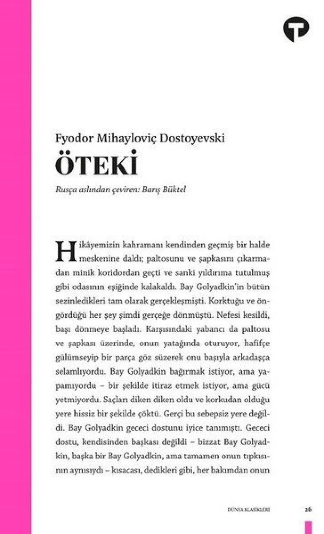 Memur Golyadkin, aniden çevresinde beliren ve her yönüyle kendisine tıpatıp benzeyen sureti yüzünden tüm itibarını yitirme tehlikesiyle karşı karşıya kalır. Dostoyevski’nin en tartışmalı kitaplarından olan Öteki, ürkütücü ve tekinsiz atmosferiyle okuru gerilim dolu bir yolculuğa çıkarıyor.