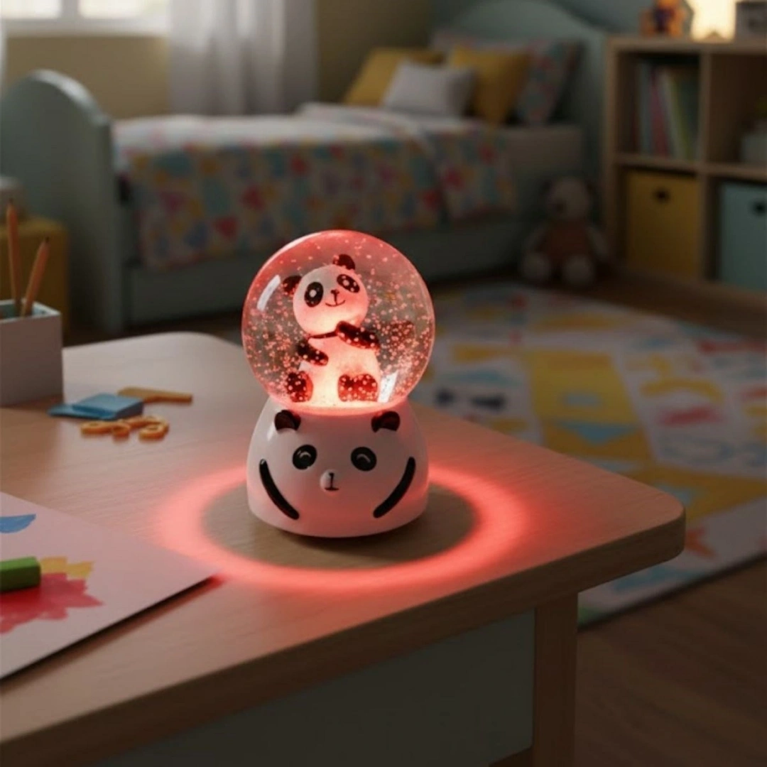 Pilli Işıklı Müzikli Kar Küresi–Sevimli Panda Figürlü Eğlenceli Masaüstü Biblo, LED Aydınlatmalı Dekoratif Hediyelik Kar Küresi