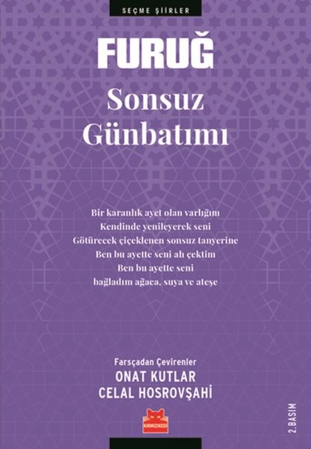 1965 yılında yaşamöyküsünü ünlü yönetmen Bertolucci’nin belgesel film yaptığı, şiirleri ve hayatıyla tüm dünyada biricik yere sahip adlardan Furuğ Ferruhzad. Kısacık yaşamına rağmen (1935-1967) modern İran şiirinin en parlak temsilcilerindendir Furuğ. Sonuncusu tamamlanmamış olmakla birlikte beş şiir kitabıyla önce İran’da sonra tüm dünyada ezilen kadınların sesi olmuş bir şair aynı zamanda. Sonsuz Günbatımı, Furuğ’un tüm okuyanları etkisi altına alan duyarlılığıyla; insanı, doğayı, zamanı, mekânı derin şiir diliyle sorguladığı şiirlerinden ustalıklı bir seçki. Onat Kutlar ve hem Kutlar’ın hem de Furuğ’un yakın dostu Celal Hosrovşahi’nin seçtikleri şiirler ve ustalıklı çevirileri, şairin şiir dünyasını tüm yoğunluğuyla aktarıyor. Sonsuz Günbatımı hacmen küçük ancak her kelimesi, her dizesiyle zihinlerinizde balyoz etkisi yaratacak bir kitap.