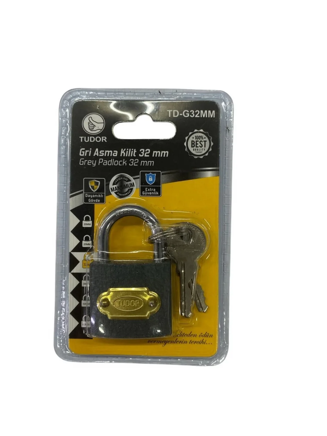 Tudor 32 mm Kısa Gri Asma KilitKorozyana karşı pirinç silindirKrom kaplama çelik kancaPaslanmaz yaylarDarbeye dayanıklı demir gövde